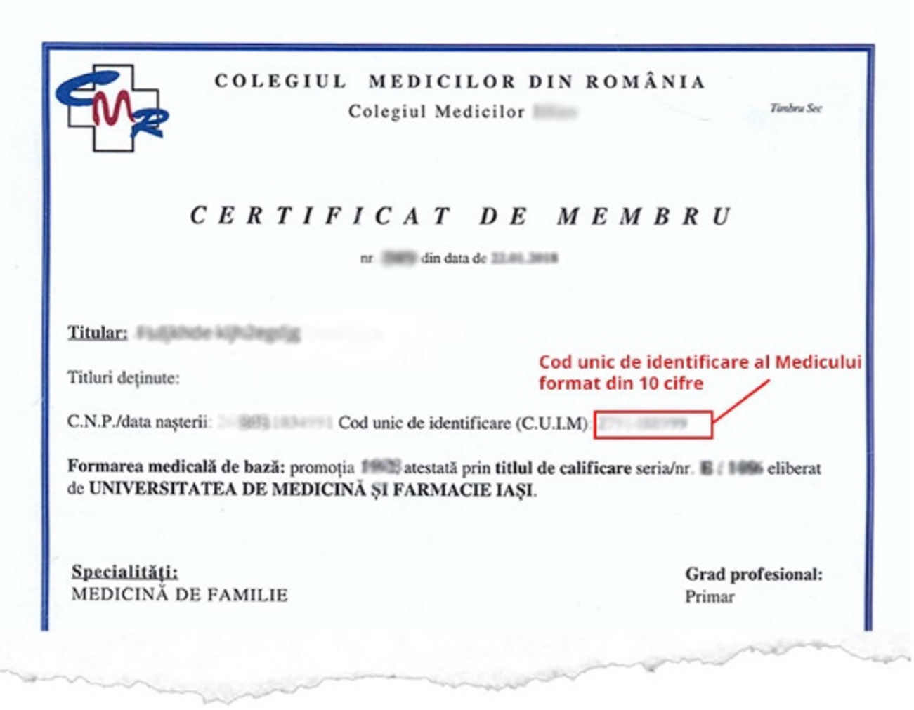 ATENȚIE! Este foarte important să completați Codul Unic de Identificare al Medicului (CUIM) în mod corect pentru că astfel punctele EMC obținute de Dumneavoastră în cadrul evenimentelor vor fi recunoscute de CMR. În lipsa acestui identificator, diploma de participare nu se va regăsi în baza de date a Colegiului. Codul Unic de Identificare al Medicului se găsește pe Certificatul de Liberă Practică emis de CMR, pe poziția din imaginea de mai jos.